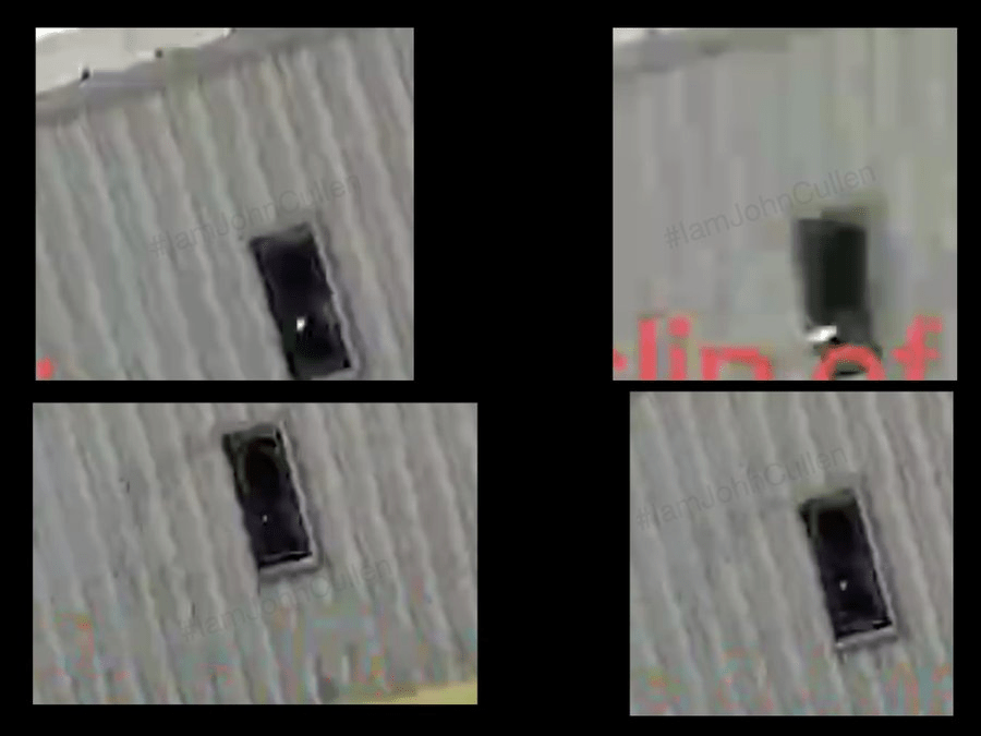 UPDATE: The video just below is the most recent, longest, clearest and best version of the video that shows the flashes in the first-floor window of Crooks building. We can see that the flashes follow the barrage of shots that apparently come from the roof, thus greatly lowering the probability that the flash in the window came from a sniper firing from inside the room. The flashes can easily be seen some seconds after the barrage from the roof ends. You do not even need to slow the video to see them. ABN