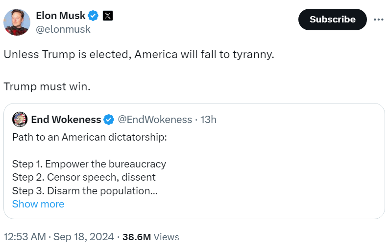 I accept we have an elite. Musk is better than Gates. Trump is better than Harris, who is a puppet of the totalitarians. RFK Jr is better than Fauci. Yes, Whitney, I know no one is perfect. As a pragmatic probabilist, I prefer the Trump faction over the other choice, which is truly a dead end. With Trump our odds for a better country with a better future are higher by far than any other probable option. ABN