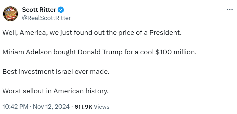 I doubt this is the whole story. One thing is clear — the extra 10 million votes Biden received in 2020 courtesy of US IC were not given to Kamala, so the election this year was more or less ‘fair’ insofar as that word means anything in politics. What this added factor of IC not adding 10 million votes to the computer system for Kamala means is Trump had to have cut a deal with IC before the election. What was the deal? Hard to say, but bomb Iran is likely. So maybe Trump traded bomb Iran for getting elected, after which he plans to end the war in Ukraine and fix lots of other stuff. Who controls IC? That is the really big question. Trump probably knows but there is no way we can be sure of that and neither can he. All he knows is he made a deal with some people and they delivered a clean-enough election to give him victory. Were the people he made a deal with the people who are really in control, or just their emissaries? I doubt Trump really knows. This is the real nature of power in a KOBK world. How big is Israel’s role in US power-plays? The answer is similar — no one really knows. Do the top Jews in the world know for sure how much power they have? Do they control US IC or do they just think they do? The impossibility of answering these questions reveals the true nature of power in this world and why we have so many wars. If you can bomb your adversary, really kill them, you know at least you are more powerful than them. ABN