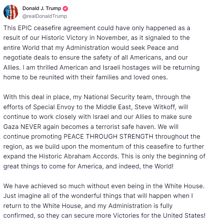 “WE HAVE A DEAL FOR THE HOSTAGES IN THE MIDDLE EAST. THEY WILL BE RELEASED SHORTLY. THANK YOU!” Trump writes on Truth Social.