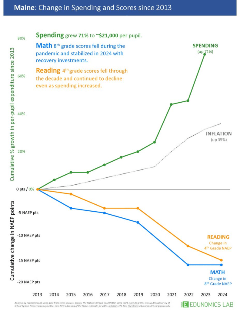 If those results weren’t shocking enough, Georgetown University’s McCourt School of Public Policy has compared NAEP performance in every state with the state’s growth in per pupil spending. According to the University’s Edunomics Lab report, Maine students’ test schools have dropped even as per pupil spending has skyrocketed.