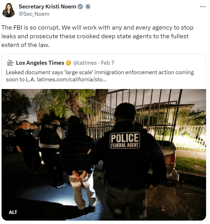 Today, it appears that Dept of Homeland Security Secretary Kristi Noem is confirming the leak came from the FBI as she says, “The FBI is so corrupt. We will work with any and every agency to stop leaks and prosecute these crooked deep state agents to the fullest extent of the law.”
