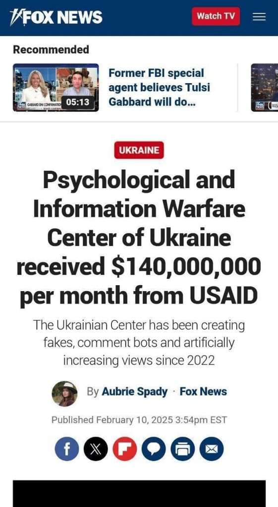 The psychological and information warfare center of Ukraine received $140,000,000 per month from USAID February 20, 2025 ~ ABN Share this: Share on Reddit (Opens in new window) Reddit Share on X (Opens in new window) X Share on Facebook (Opens in new window) Facebook Share on LinkedIn (Opens in new window) LinkedIn Email a link to a friend (Opens in new window) Email Print (Opens in new window) Print Like Loading... Related Published by ABN View all posts by ABN