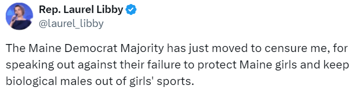 Censured because she disagrees with their nonsense. The left is absurd and tends to become dictatorial. Historically, leftist dictatorships have always been worse than rightist authoritarians. Surely males in female sports can openly be discussed? Not in Mills’ Maine. ABN