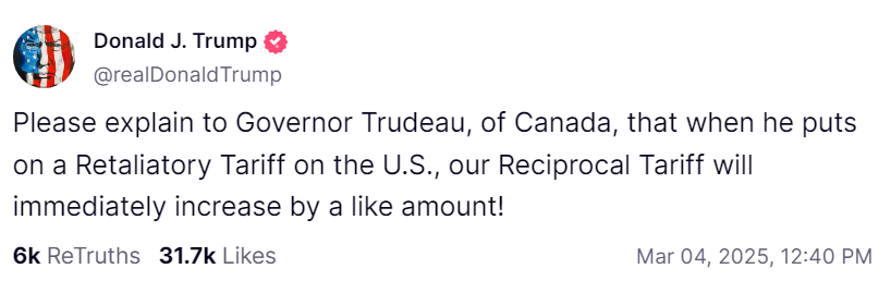 Trump on Canada tariffs March 4, 2025 ~ ABN Share this: Share on Reddit (Opens in new window) Reddit Share on X (Opens in new window) X Share on Facebook (Opens in new window) Facebook Share on LinkedIn (Opens in new window) LinkedIn Email a link to a friend (Opens in new window) Email Print (Opens in new window) Print Like Loading... Related Published by ABN View all posts by ABN