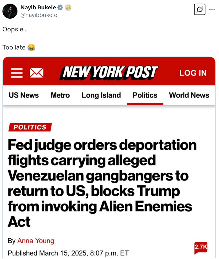 Bukele is rightly mocking Judge Boasberg. A major reason you want to keep your country clean, law-abiding, and competent is to avoid needing a prison system like the one in El Salvador, or having judges like Boasberg. ABN