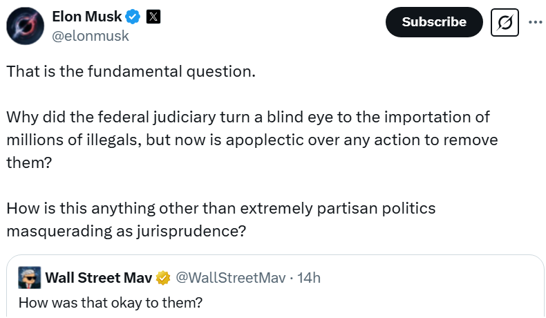 Why did the federal judiciary turn a blind eye to the importation of millions of illegals, but now is apoplectic over any action to remove them? March 23, 2025 ~ ABN __________ Proof that it’s war and they are corrupt. ABN Share this: Share on Reddit (Opens in new window) Reddit Share on X (Opens in new window) X Share on Facebook (Opens in new window) Facebook Share on LinkedIn (Opens in new window) LinkedIn Email a link to a friend (Opens in new window) Email Print (Opens in new window) Print Share on Pocket (Opens in new window) Pocket Like Loading... Related Published by ABN View all posts by ABN
