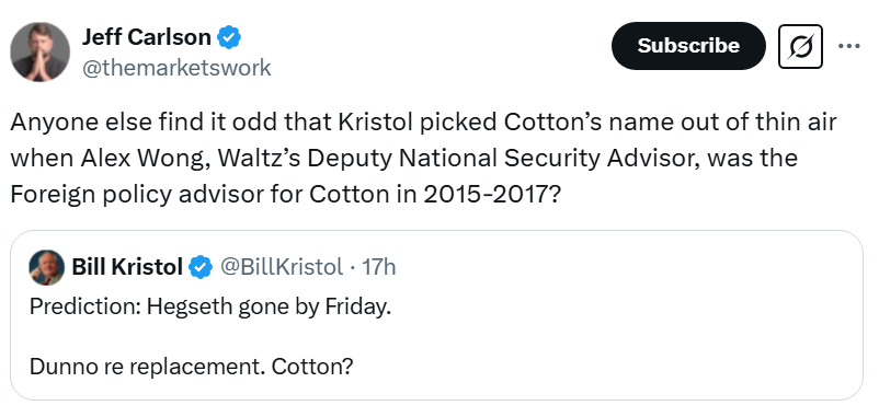 Anyone else find it odd that Kristol picked Cotton’s name out of thin air when Alex Wong, Waltz’s Deputy National Security Advisor, was the Foreign policy advisor for Cotton in 2015-2017?