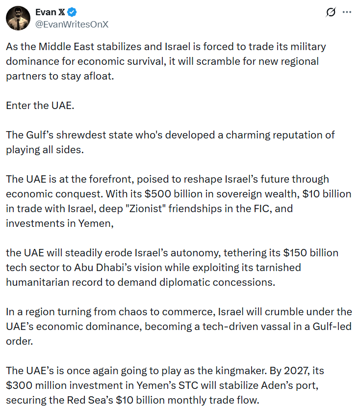 As the Middle East stabilizes and Israel is forced to trade its military dominance for economic survival, it will scramble for new regional partners to stay afloat April 17, 2025April 17, 2025 ~ ABN continue reading… Share this: Share on Reddit (Opens in new window) Reddit Share on X (Opens in new window) X Share on Facebook (Opens in new window) Facebook Share on LinkedIn (Opens in new window) LinkedIn Email a link to a friend (Opens in new window) Email Print (Opens in new window) Print Like Loading... Related Published by ABN View all posts by ABN