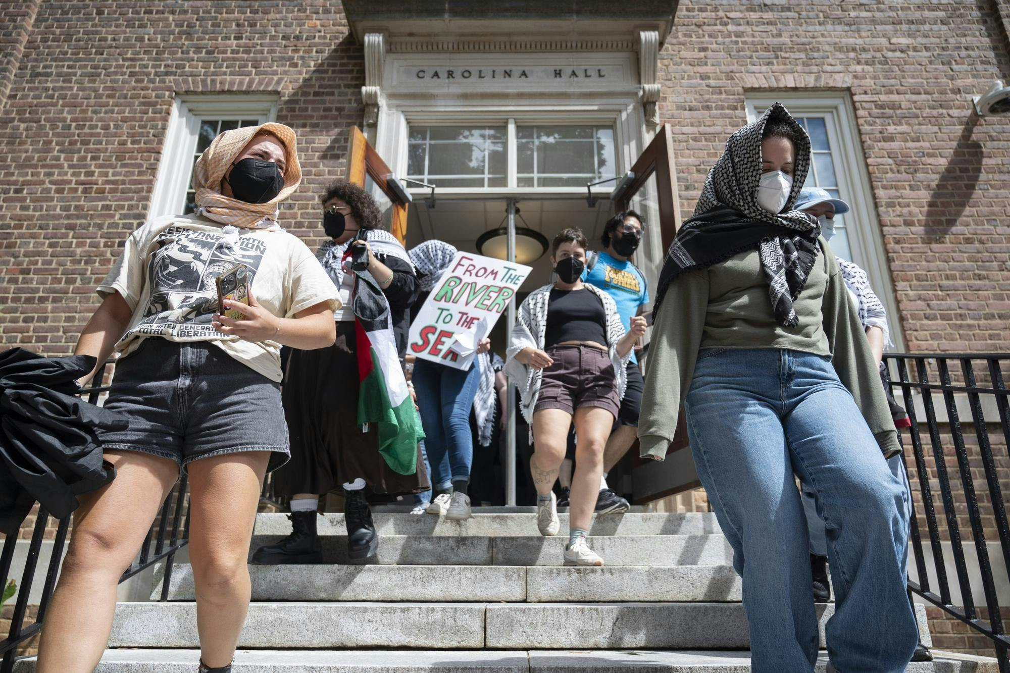We marched in a loop across campus. We went from the student union, to the historic district, to the library, and back to the student union. Overall I’d say we covered about a mile of ground. We had supporters. There’s a large Arab population close to campus, and we’d see Arab guys roll down the windows of their cars and cheer for us. It felt nice to have some people on our side. The trouble that showed up took the form of a small group of nasally enhanced individuals wearing sunglasses who joined our march when we reached the historic district. This group was composed of a bunch of creeps wearing dark clothes and ballcaps, who would slink into the crowd and attempt to covertly take photos of the marchers with phone cameras up their sleeve. I asked my lanky comrade about these freaks, and he told me the ADL hires people, usually Hillel students, to monitor student social media related to Palestine. These losers go to all SJP marches, and they try to dox students that go to them. Completely covering my face and body wasn’t overkill at all. They also try to bait people into losing their cool and punching them, catching assault charges. Little digs to try and ruin the lives of anyone standing against them.
