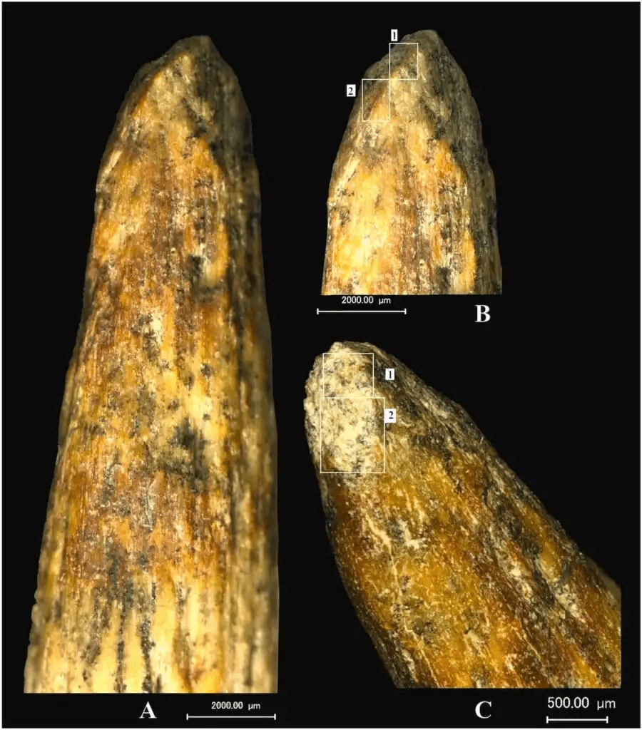 The spear tip was initially found in 2003, buried within a sediment layer in a cave in the North Caucasus, Russia. Alongside it were numerous animal bones and remnants of a campfire. However, it wasn’t until recently that the spear tip was thoroughly examined.