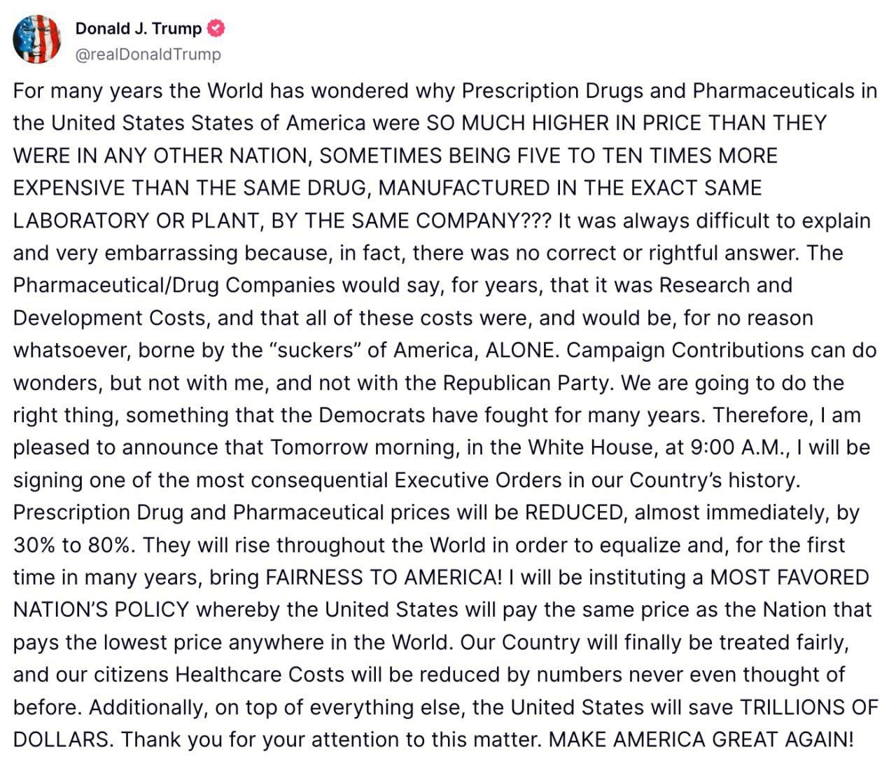 For many years the World has wondered why Prescription Drugs and Pharmaceuticals in the United States States of America were SO MUCH HIGHER IN PRICE THAN THEY WERE IN ANY OTHER NATION, SOMETIMES BEING FIVE TO TEN TIMES MORE EXPENSIVE THAN THE SAME DRUG, MANUFACTURED IN THE EXACT SAME LABORATORY OR PLANT, BY THE SAME COMPANY??? It was always difficult to explain and very embarrassing because, in fact, there was no correct or rightful answer. The Pharmaceutical/Drug Companies would say, for years, that it was Research and Development Costs, and that all of these costs were, and would be, for no reason whatsoever, borne by the “suckers” of America, ALONE. Campaign Contributions can do wonders, but not with me, and not with the Republican Party. We are going to do the right thing, something that the Democrats have fought for many years. Therefore, I am pleased to announce that Tomorrow morning, in the White House, at 9:00 A.M., I will be signing one of the most consequential Executive Orders in our Country’s history. Prescription Drug and Pharmaceutical prices will be REDUCED, almost immediately, by 30% to 80%. They will rise throughout the World in order to equalize and, for the first time in many years, bring FAIRNESS TO AMERICA! I will be instituting a MOST FAVORED NATION’S POLICY whereby the United States will pay the same price as the Nation that pays the lowest price anywhere in the World. Our Country will finally be treated fairly, and our citizens Healthcare Costs will be reduced by numbers never even thought of before. Additionally, on top of everything else, the United States will save TRILLIONS OF DOLLARS. Thank you for your attention to this matter. MAKE AMERICA GREAT AGAIN!