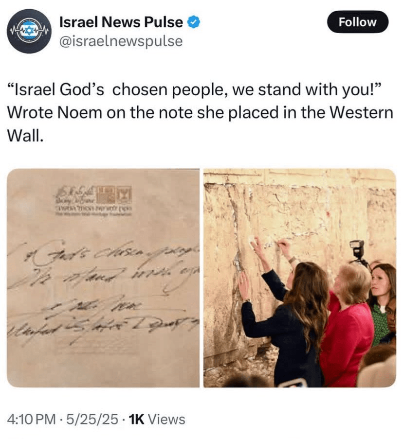 False and stupid but does not totally disqualify her, imo. It’s possible the super-duper-pro Jewish Supremacy posture of the Trump admin is a ruse being employed to mollify Jewish Supremists as they sideline them. The way they act like adoring adolescents when asked about what is most important for USA and answer ‘protecting Israel’, to me, is a tell. Politicians have the reputation of being actors who were not good-looking enough for the movies. Maybe they are also not so good at the thespian arts, or Christian theology, or history for that matter, the wall is actually remains of a Roman fort. ABN
