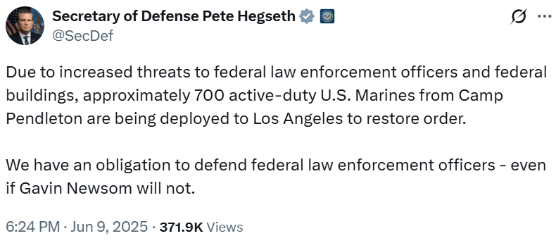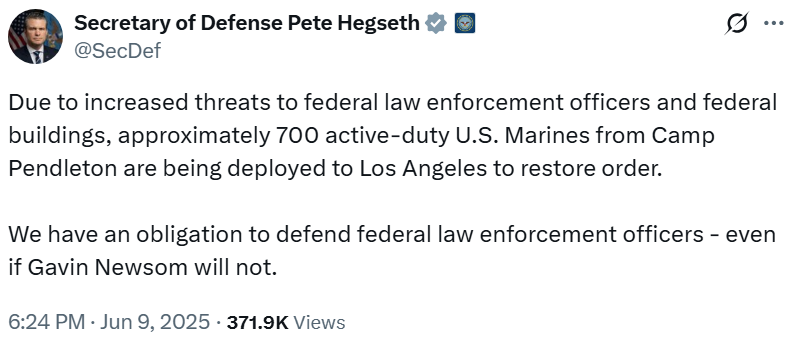 700 US Marines being deployed to Los Angeles to restore order — Hegseth