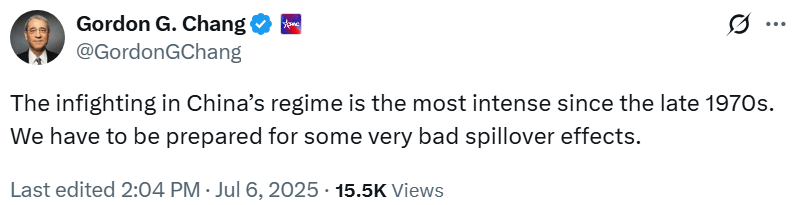 China infighting intense July 6, 2025July 6, 2025 ~ ABN Share this: Share on Reddit (Opens in new window) Reddit Share on X (Opens in new window) X Share on Facebook (Opens in new window) Facebook Share on LinkedIn (Opens in new window) LinkedIn Email a link to a friend (Opens in new window) Email Print (Opens in new window) Print Like Loading... Related Published by ABN View all posts by ABN