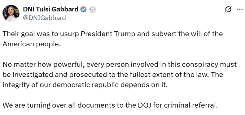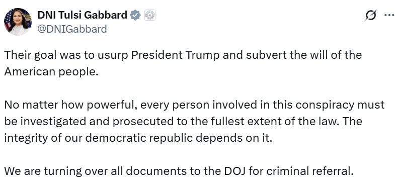 We are turning over all documents to the DOJ for criminal referral — Gabbard