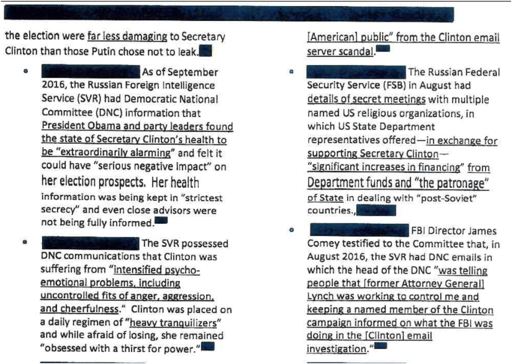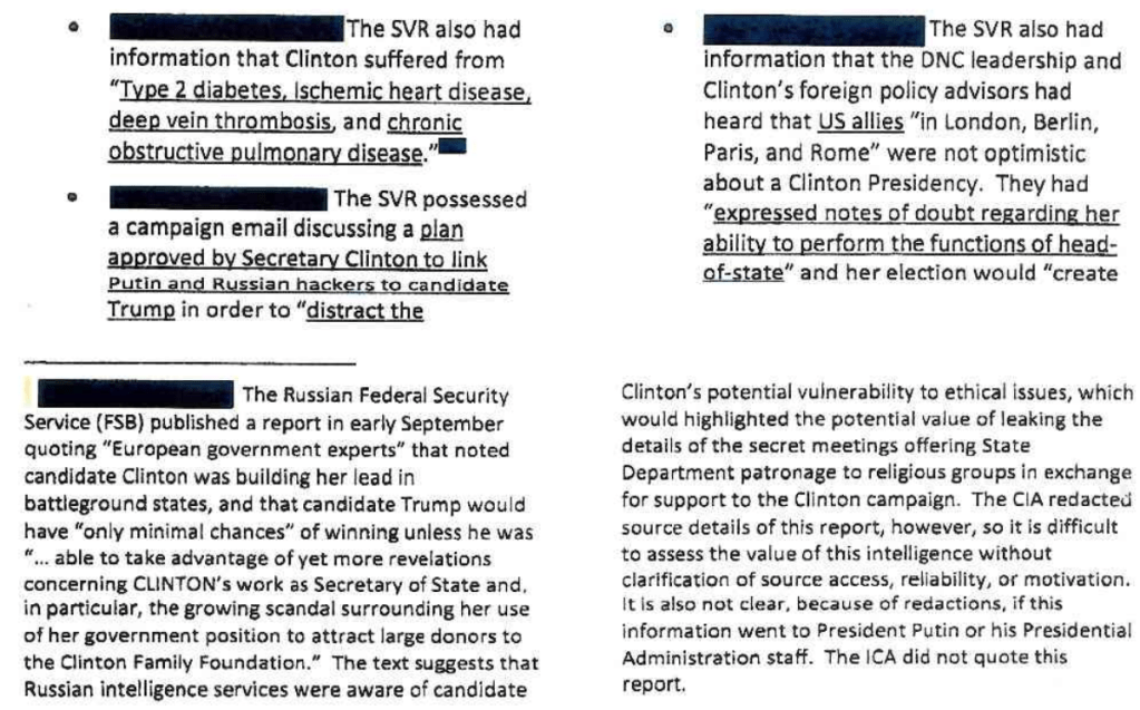 The SVR possessed DNC communications that Clinton was suffering from “intensified psycho-emotional problems including uncontrolled fits of anger aggression and cheerfulness.” Clinton was placed on a daily regimen of “heavy tranquilizers” and while afraid of losing, she remained “obsessed with a thirst for power.”