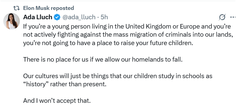 Musk agrees and deserves credit for this position August 30, 2025 ~ ABN __________ Support elites who support us. Mass immigration is an act of war. ABN Share this: Share on Reddit (Opens in new window) Reddit Share on X (Opens in new window) X Share on Facebook (Opens in new window) Facebook Share on LinkedIn (Opens in new window) LinkedIn Email a link to a friend (Opens in new window) Email Print (Opens in new window) Print Share on Pocket (Opens in new window) Pocket Like Loading... Related Published by ABN View all posts by ABN