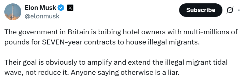 Britain bribing hotel owners to extend illegal migrant tidal wave — Musk