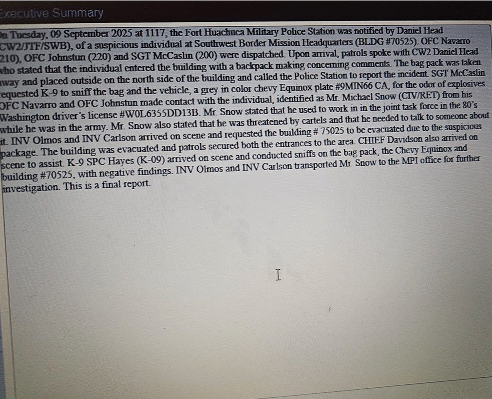 Find your favorite podcaster who joined the psychological operation to convince you Mitch was lying about having been at Fort Huachuca on 9/9 because I have just received the incident report.
