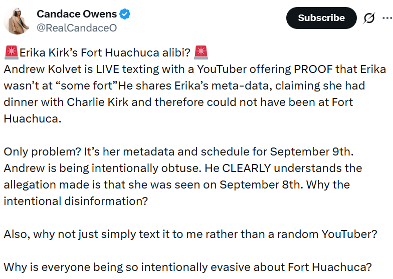 Candace Owens: Erika Kirk’s Fort Huachuca alibi? December 27, 2025December 27, 2025 ~ ABN link A major problem with this ‘proof’ is the boy is too old to be Charlie’s son, in addition to the date not being the time or day Erika may have been sighted at Fort Huachuca. ABN Share this: Click to share on Reddit (Opens in new window) Reddit Click to share on X (Opens in new window) X Click to share on Facebook (Opens in new window) Facebook Click to share on LinkedIn (Opens in new window) LinkedIn Click to email a link to a friend (Opens in new window) Email Click to print (Opens in new window) Print Click to share on Pocket (Opens in new window) Pocket Like Loading... Related Published by ABN View all posts by ABN
