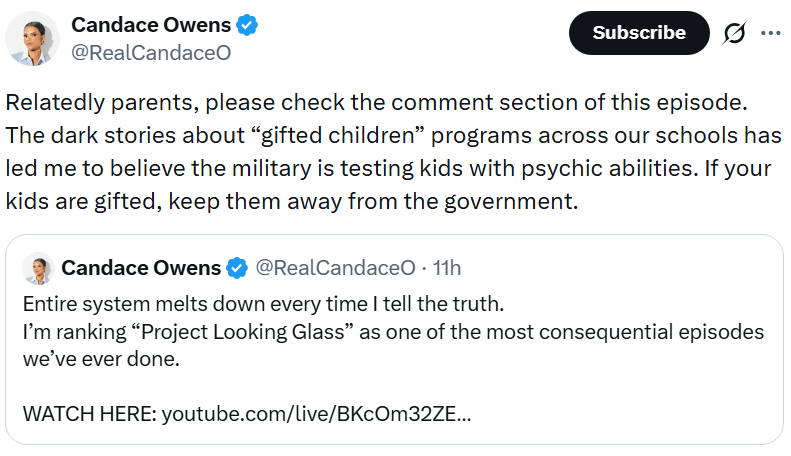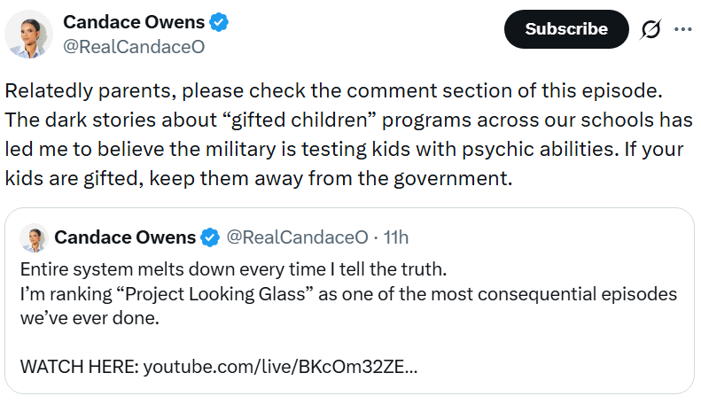‘The dark stories about “gifted children” programs across our schools has led me to believe the military is testing kids with psychic abilities’ — Candace Owens