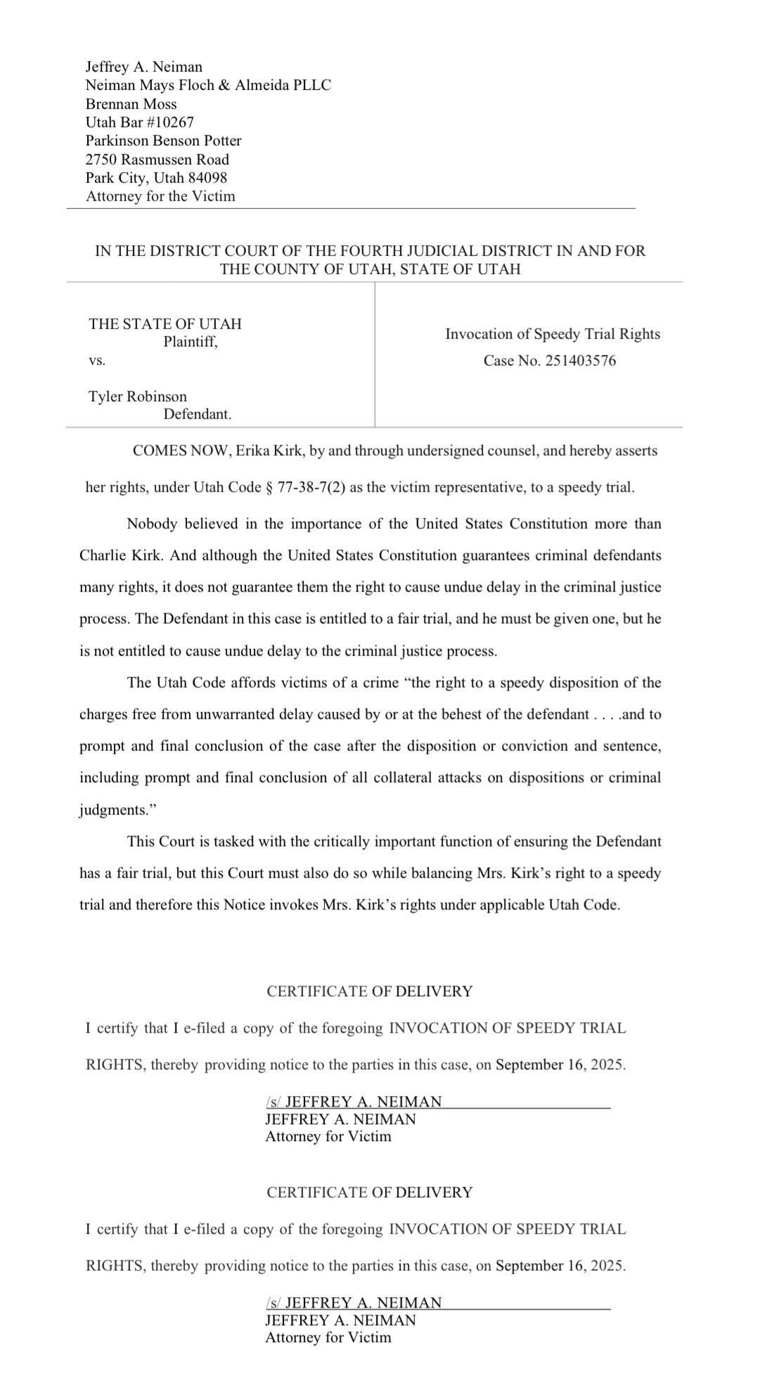 - Filed September 16, 2025, the motion invokes Utah Code §77-38-7(2), asserting victims’ rights to prompt case resolution free from unwarranted delays, while emphasizing constitutional balances against undue defense procrastination, as detailed in official court documents.