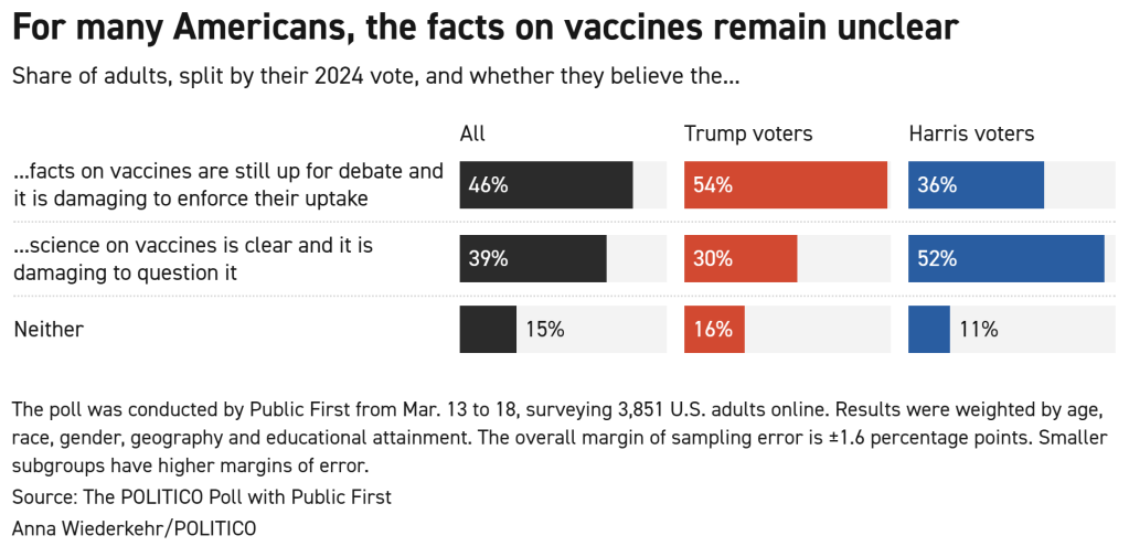 Results from the March poll of 3,851 U.S. adults conducted by Public First show that a plurality of Americans question the safety of vaccines, support reducing the number administered and believe that people’s right to decide what they put in their bodies is more important than preventing the spread of disease.