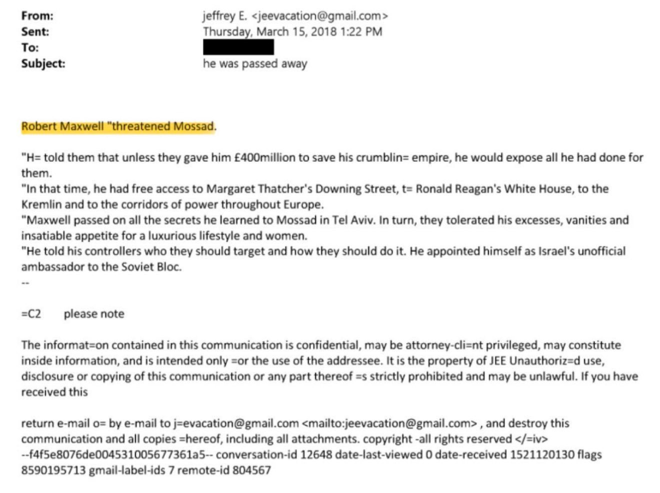 Robert Maxwell was Ghislaine Maxwell’s father. Epstein saying ‘he was passed away’ in the subject heading must mean Robert Maxwell was murdered for threatening Mossad, a fate which may have befallen Epstein himself. The recent release of Epstein files amply reveals the violence and depravity of the group of Jewish Supremists Epstein consorted with. USA Congress publicly and shamelessly bows and scrapes before Netanyahu whenever he visits. Christian Zionists (the majority of whom are victims of JS infiltration and mind-control) falsely believe the Bible says Jews are superior to them and must be worshipped. ‘Judeo-Christian values’ is and has always been a JS mind-control psyop. The Catholic Church has for centuries been infiltrated by JS. It is very plausible that Christianity itself was created by Jewish (and Roman Flavian) Supremists to control the Roman Empire. ABN