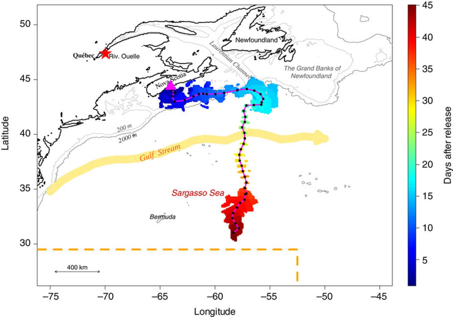 It’s also where the life cycle of the American eel both begins and ends. They’re born there, and after a few decades — eels are incredibly long-lived animals — they swim back in, spawn and die.