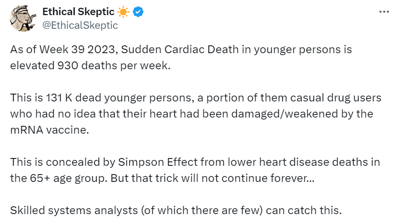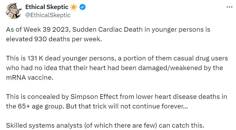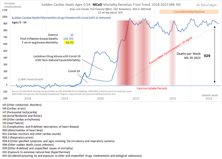 Chart of the Week: Sudden Cardiac Death Ages 0-54 = 66.3% or 21-sigma excess, which began 12 days after the rollout of the shots 14 Dec 2020 and has not abated in the least. 125,000 dead younger persons – and the government/media are silent.