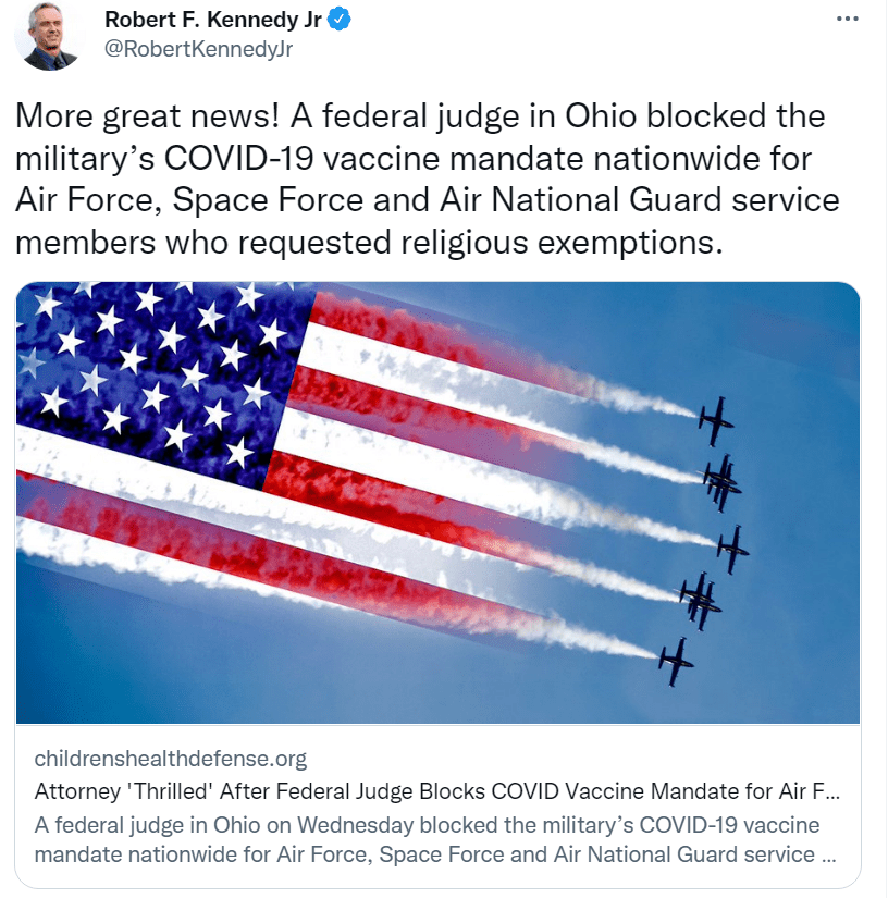 Link to article: Attorney ‘Thrilled’ After Federal Judge Blocks COVID Vaccine Mandate for Air Force, Air National Guard