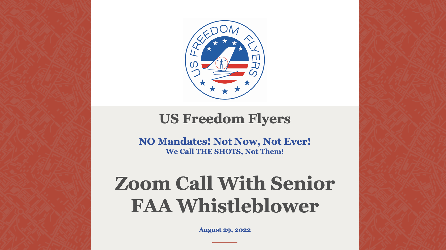 At 2:00 pm Central Time on Tuesday, August 30th – details below), senior FAA official Bruce McGray will publicly present, for the first time, his sworn declaration and supporting exhibits (links at very bottom) against the agency for its involvement in the vaccine mandate and the resultant fallout. The presentation will be aired via Zoom and we need as many of our members as possible to join the call. The purpose is both to present the complaint and ensure that all members have the information necessary to rescue their lives and their careers. If you hold an FAA medical and fear its loss as a result of vaccine complications, solutions will be presented.