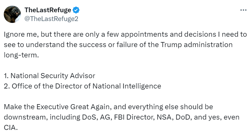 Everyone else, except you guys, will miss what each of the New York Post “leaked” names have in common. They are all in direct alignment with the retention of the Intelligence Community as it exists. For the IC, this is the team that lets them hunker down until ’28.