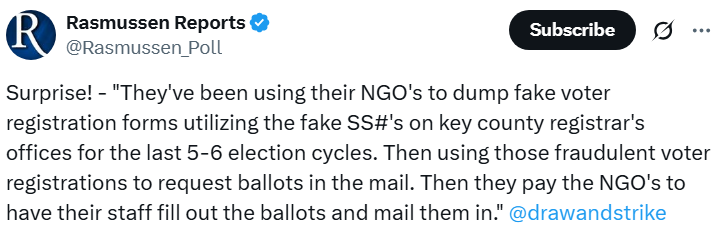 They’ve been using NGO’s to dump fake voter registration forms utilizing fake SS#’s on key county registrar’s offices for the last 5-6 election cycles